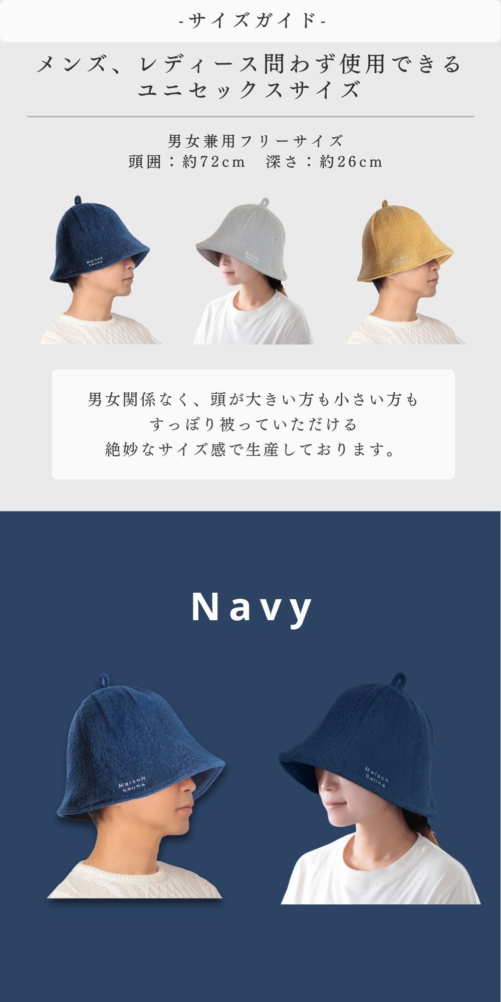 【メンズもレディースも使えるサイズ感】深くて大きいサイズで作られているので、頭の大きい男性でも髪の毛を結ぶ女性でも問題なく使っていただくことが可能です。