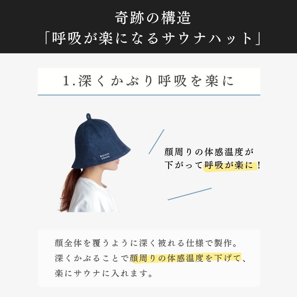 【呼吸が楽になるサウナハット】他のサウナハットよりも深く被ることができ、顔周りの温度を下げサウナハットが呼吸を楽にしてくれます。